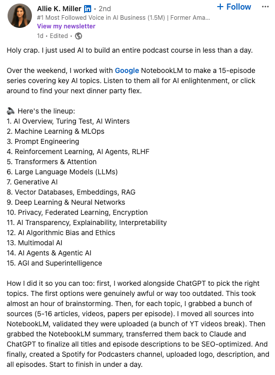Allie made it - see screenshot below. It’s basically ‘Introduction to AI’ content that was generated by AI (very meta) using that NotebookLM tool I told you about last week - people are loving it.