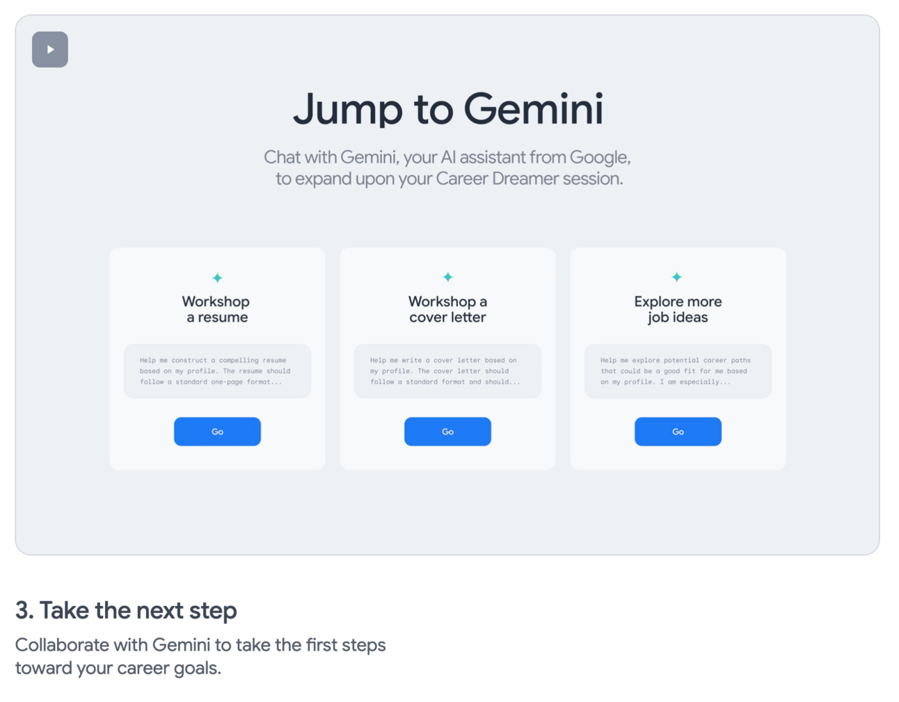 The last step is to jump into Gemini (Google’s version of ChatGPT) with some ready made prompts to help you fine tune that resume, cover letter, or continue exploring other job ideas based on what the tool has just learned about you.