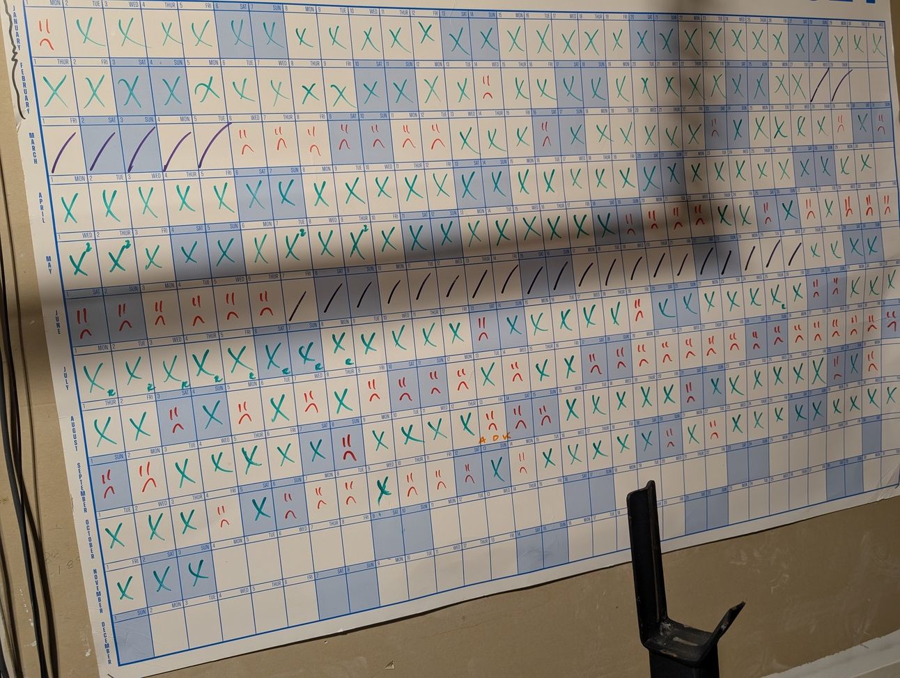 I’ve adapted this annual calendar system slightly from it’s original intention. I found more utility in using it as the world’s most in your face habit tracker.