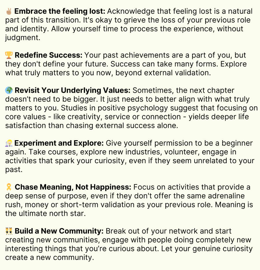 If you find yourself in a similar situation - payout or not (because as we’ve learned it’s not about the money) - here’s what Steven Bartlett recommends you do to find your new north star, and sense of purpose/meaning.